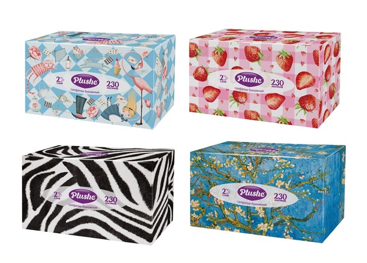 Бумажные салфетки формата нон-стоп, надежно хранятся в коробочках по 230 штук. Салфетки Plushe изготовлены из 100% первичной целлюлозы, что делает их мягкими и гипоаллергенными. Удобный формат упаковки отлично разместится, как на вашем кухонном столе, так и в детской комнате. Салфеток в коробочке хватит на всех.