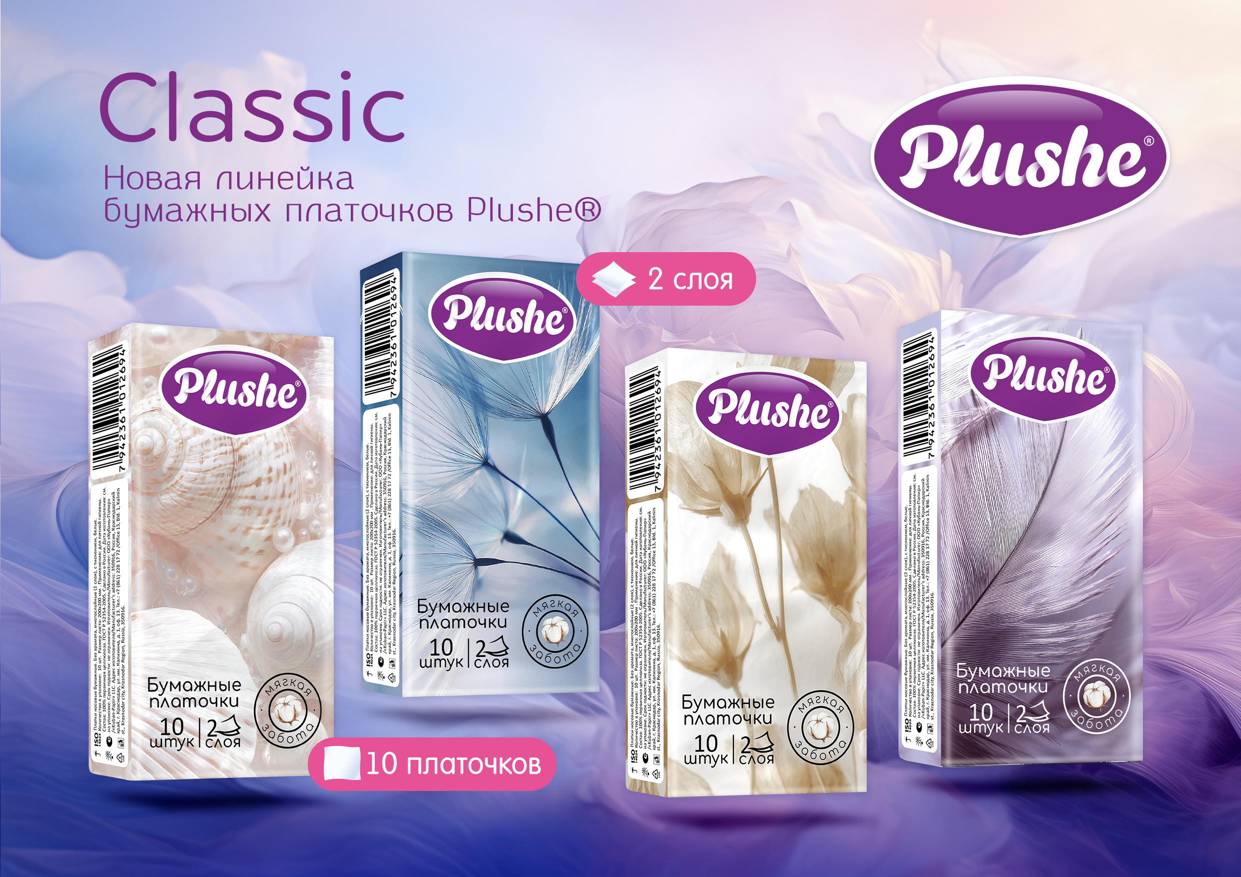 Plushe® представляет обновлённую упаковку двухслойных бумажных платочков Plushe® Classic. Визуальная концепция переосмыслена в сторону тихой эстетики: спокойная пастельная палитра, мягкая графика и природные мотивы — перья, тонкие соцветия, семена одуванчиков и морские ракушки — формируют лёгкий, воздушный образ и подчёркивают деликатную мягкость продукта.
