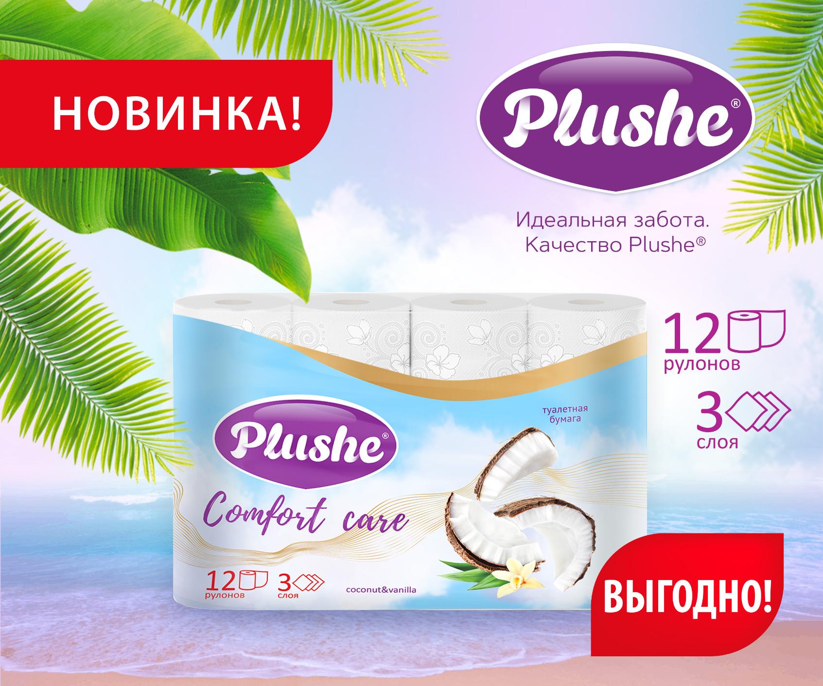 Новая линейка трехслойной туалетной бумаги Plushe Comfort Care доступна в удобной упаковке из 12 рулонов. Не упустите возможность попробовать этот уникальный продукт и насладиться нежностью и ароматом с каждым использованием!