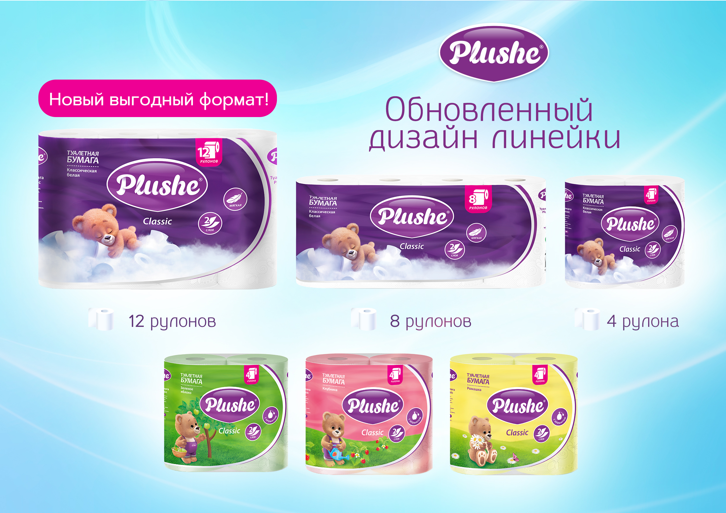 Данный дизайн упаковки адаптирован и на другие виды серии ТБ Plushe Classic с ароматом (Зеленое яблоко, Ромашка, Клубника) формата 4 и 8 рулонов.